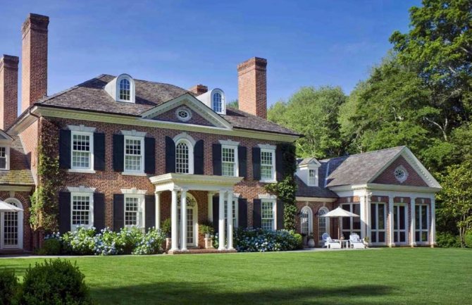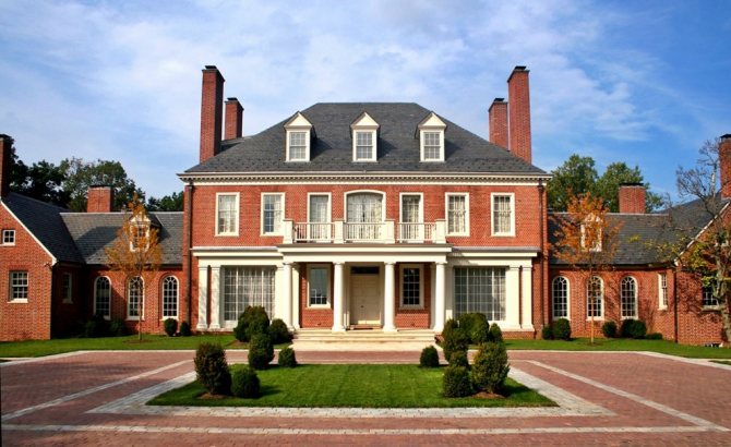 Дом такого вида – и есть классически-английский. Внутри него всегда находится камин, обрамленный пилястрами и расположенный напротив входной двери, обязательны холл и минимум одна гостевая комната. Амбары, кладовки и гаражи находятся отдельно, в автономных пристройках.